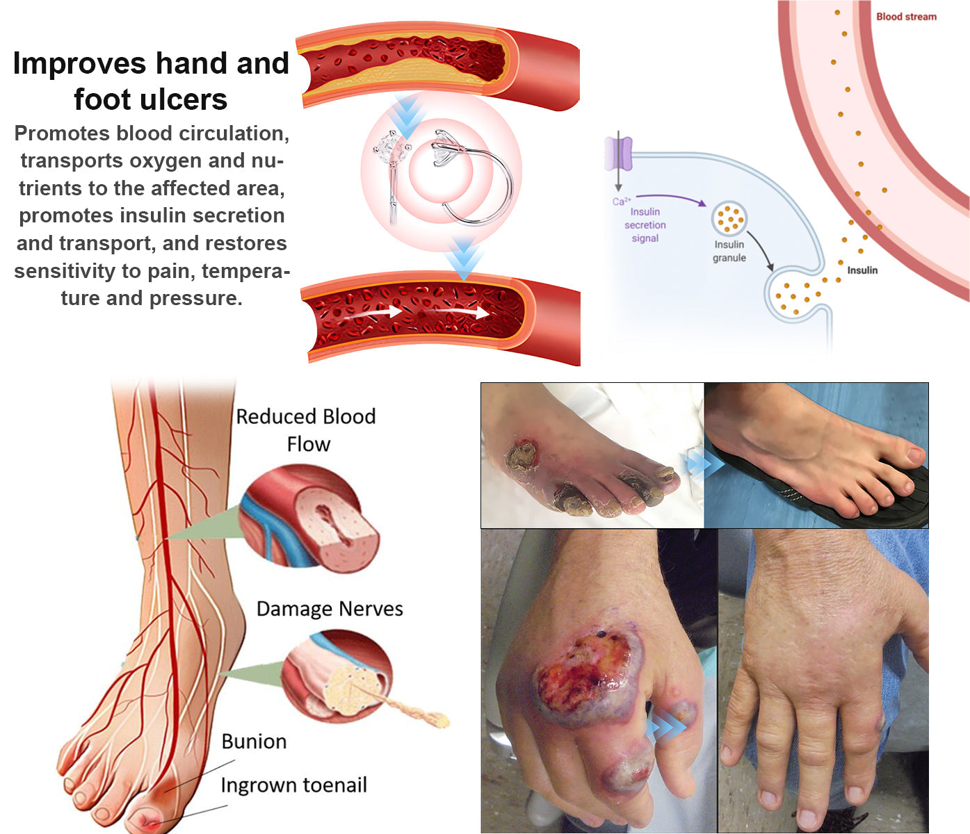 Titanium therapy can effectively promote blood circulation, increase the amount of oxygen delivered to cells, regulate the function of the pancreas to secrete insulin and glucagon, and restore human blood sugar to the normal range. In addition. improving blood circulation can activate more capillaries. restore nerve endings that have been necrotized by diabetes. make wounds heal faster. resist fungal infections. and relieve numbness. tingling. or pain in the hands and feet.