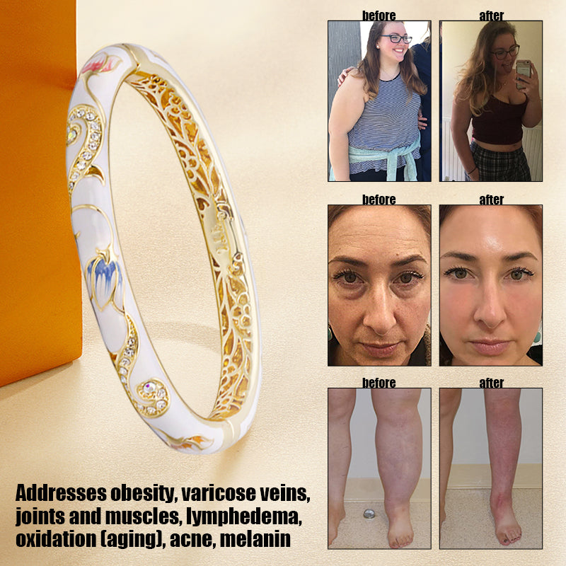 "As a professional in weight loss and beauty, I highly recommend this bracelet that combines gold-titanium alloy, neodymium, and zeolite. The gold-titanium alloy helps accelerate metabolism, promote fat burning, and improve blood circulation while alleviating joint pain. Neodymium's magnetic field effectively enhances lymphatic flow, reducing swelling and increasing overall comfort. Meanwhile, zeolite releases negative ions to detoxify the body, promoting healthier skin. With the combined benefits of these three materials, this bracelet not only supports your weight loss goals but also improves your skin condition, helping you achieve a more beautiful you."